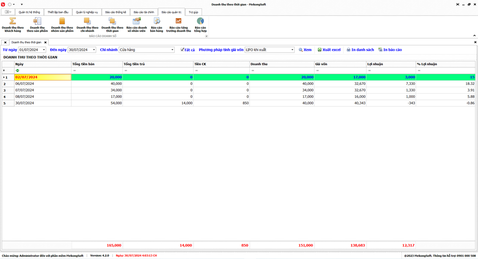 Báo cáo "Doanh thu theo thời gian" là một công cụ hữu ích giúp doanh nghiệp theo dõi sát sao tình hình kinh doanh hàng ngày. Bằng cách hiển thị chi tiết doanh thu, lợi nhuận và các chỉ số liên quan trong từng ngày, báo cáo này giúp doanh nghiệp nắm bắt được xu hướng kinh doanh, phát hiện các vấn đề và cơ hội, từ đó đưa ra các quyết định kinh doanh kịp thời và hiệu quả.