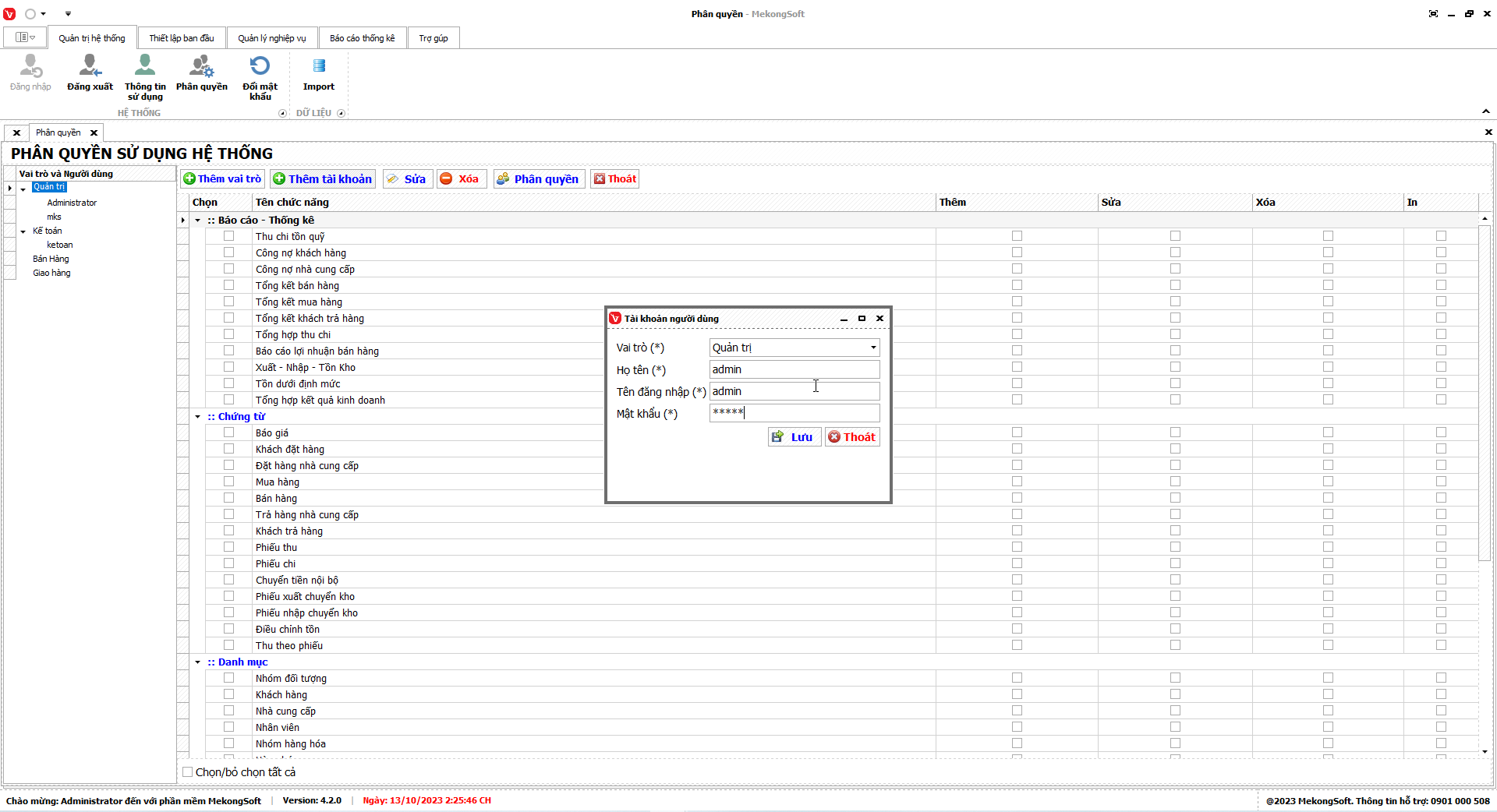 2. Tích vào các quyền cần cấp cho tài khoản gồm: quyền truy cập, thêm, sửa, xóa, in.