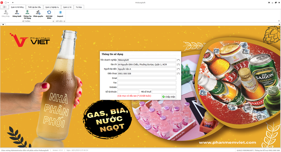 Để thiết lập thông tin sử dụng trên phần mềm quản lý bán hàng phân phối bia nước ngọt, bạn có thể thực hiện theo các bước sau: