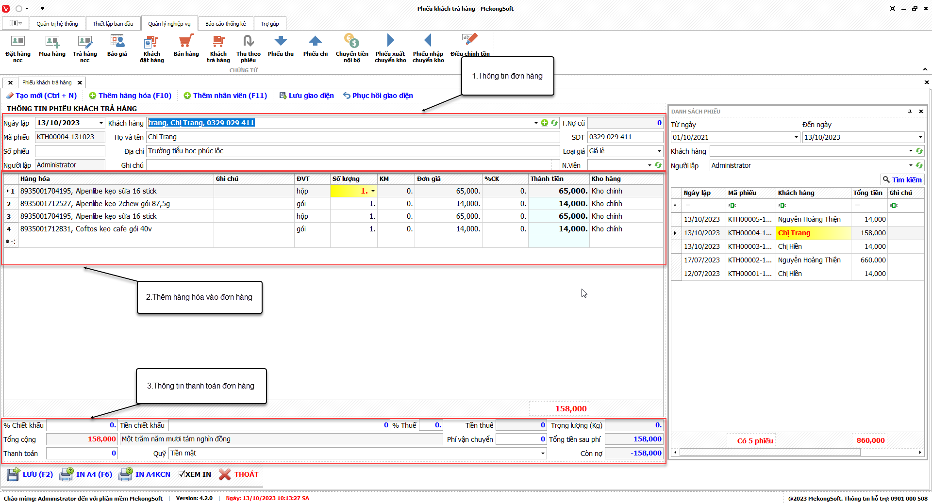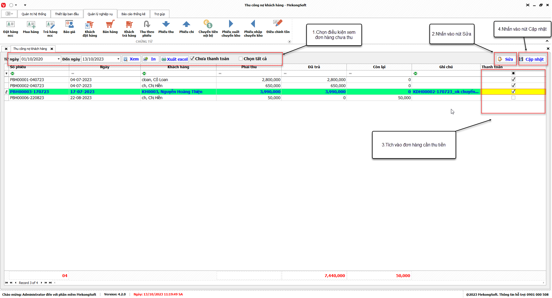 Bạn có thể sử dụng bộ lọc để tìm kiếm thông tin theo các tiêu chí như chi nhánh, phí trả hàng, thực thu, …