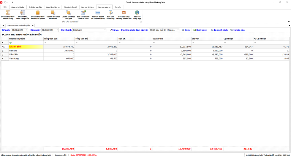 Thao tác này sẽ mở ra màn hình báo cáo tổng hợp kết quả kinh doanh. Bạn có thể xem báo cáo theo các tiêu chí sau: