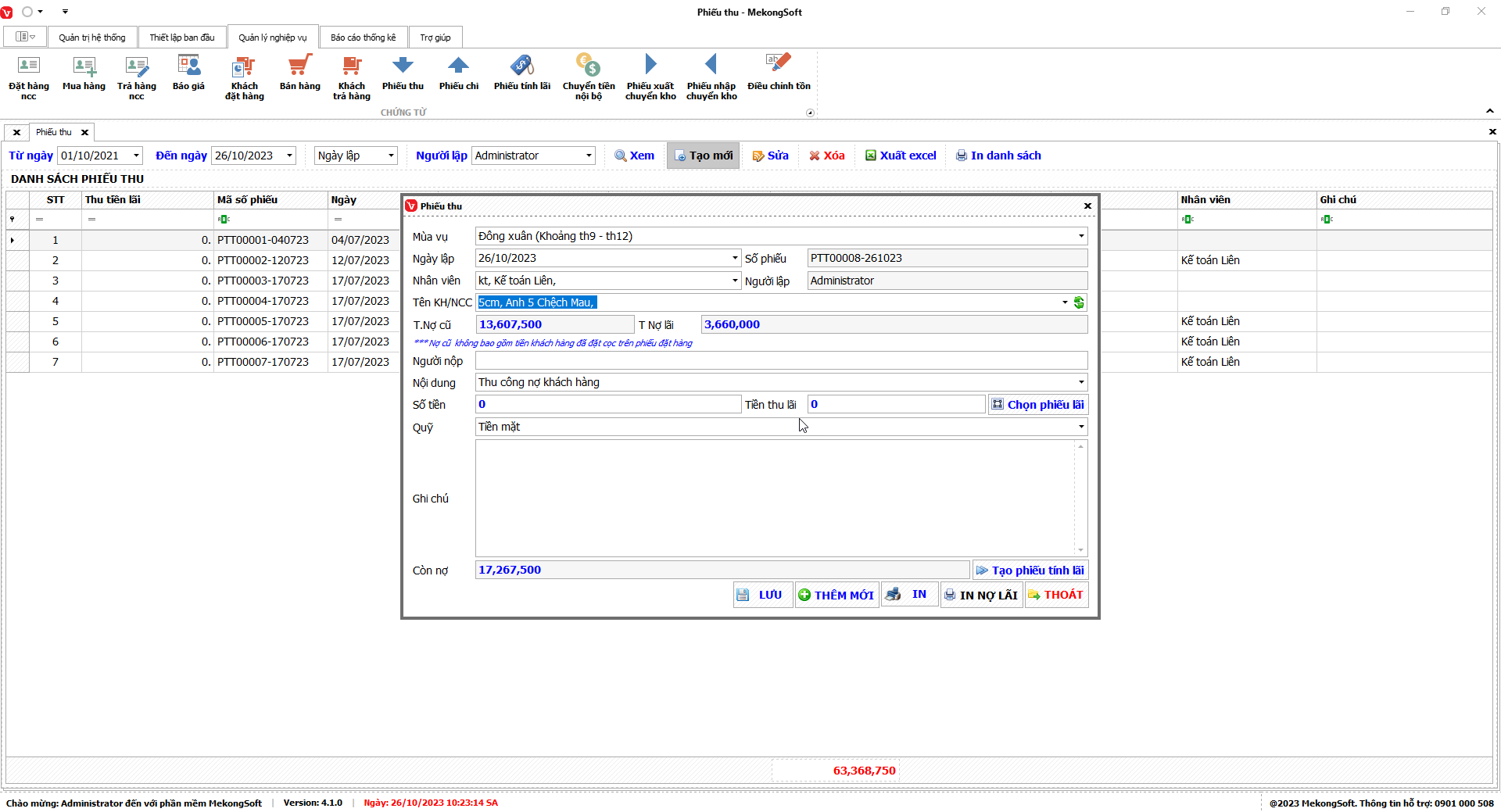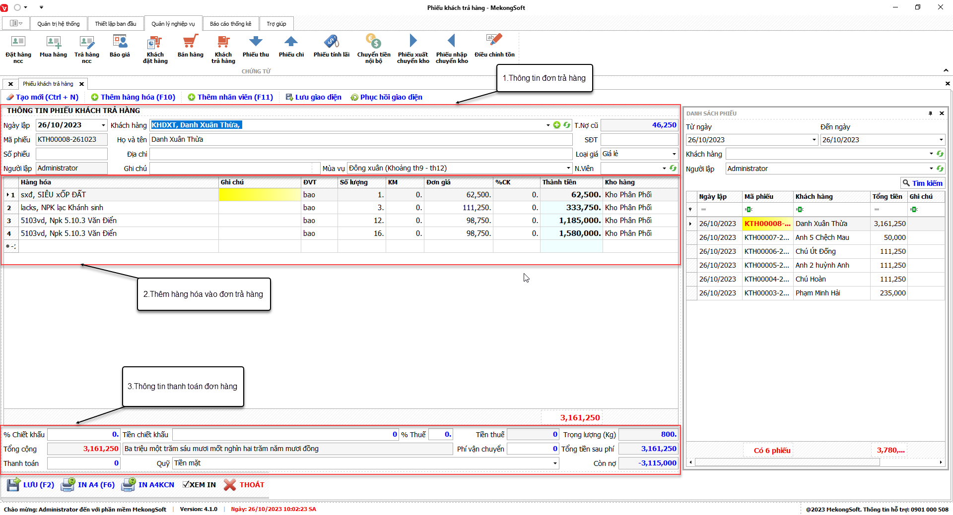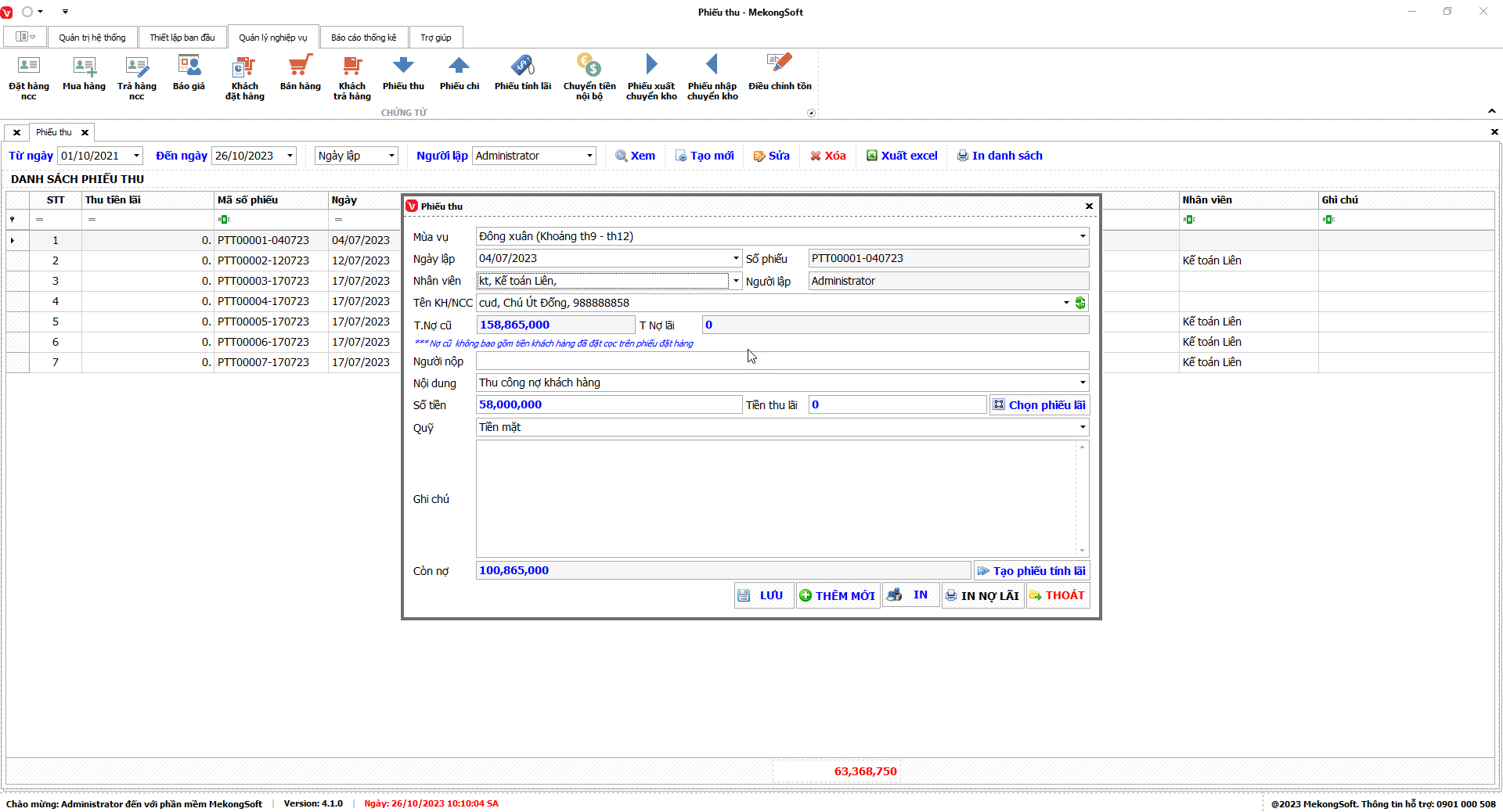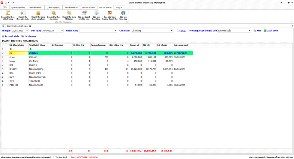Bạn có thể sử dụng bộ lọc để tìm kiếm thông tin theo các tiêu chí như mùa vụ, tổng tiền bán, tiền trả, doanh thu, …