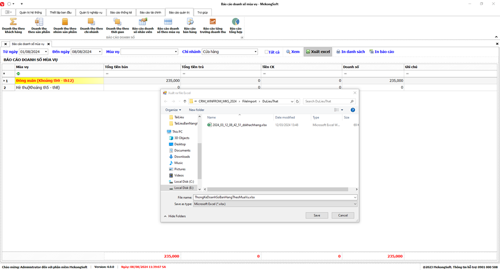 Phần mềm sẽ xuất Doanh thu theo mùa vụ dưới dạng file excel.