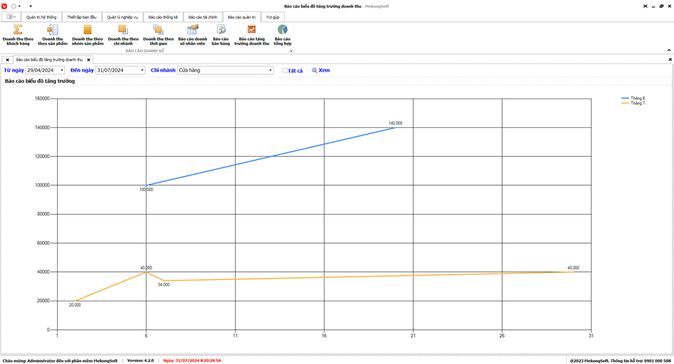 Thao tác này sẽ mở ra màn hình Báo cáo tăng trưởng doanh thu. Bạn có thể xem báo cáo theo các tiêu chí sau: