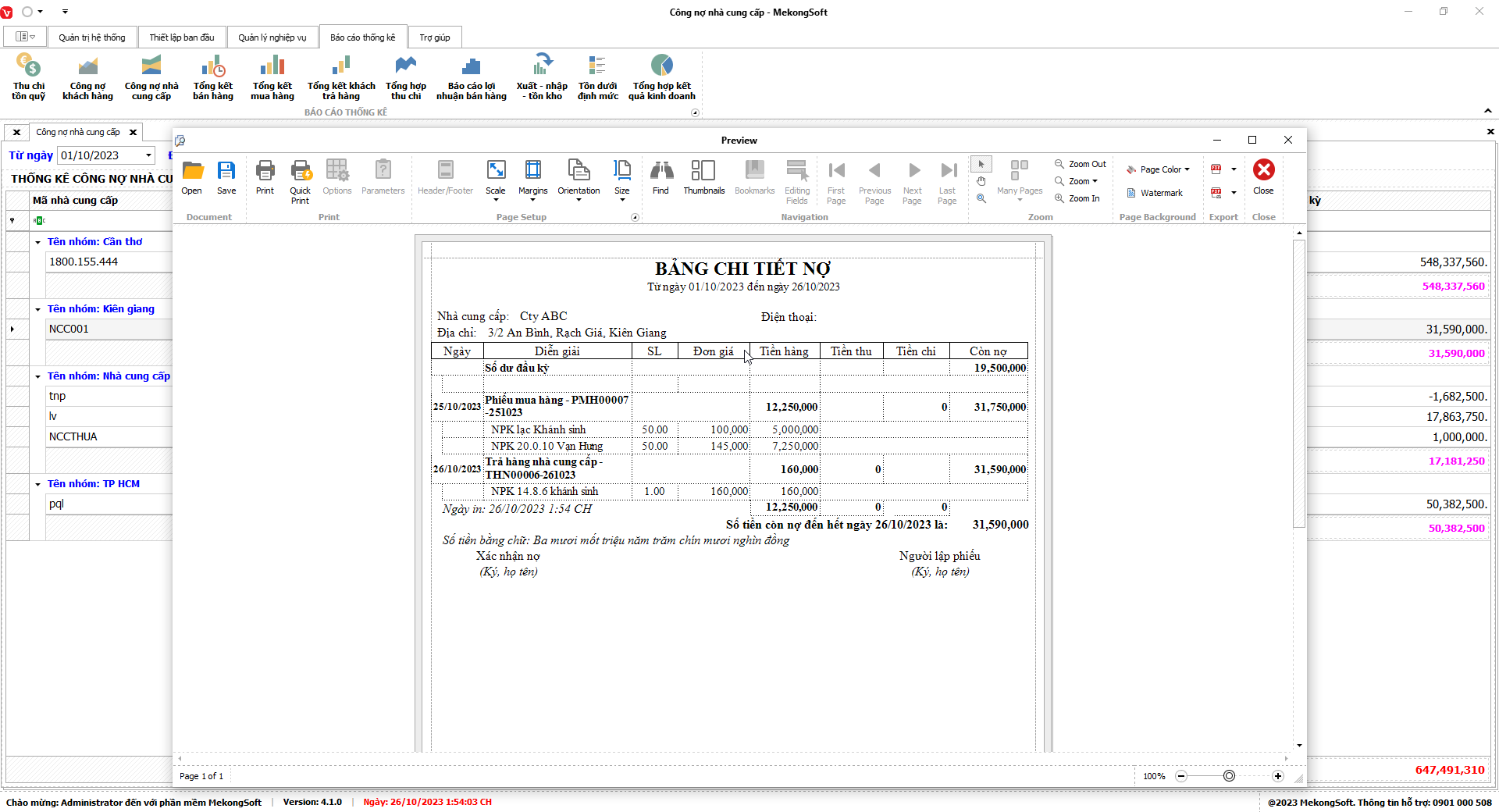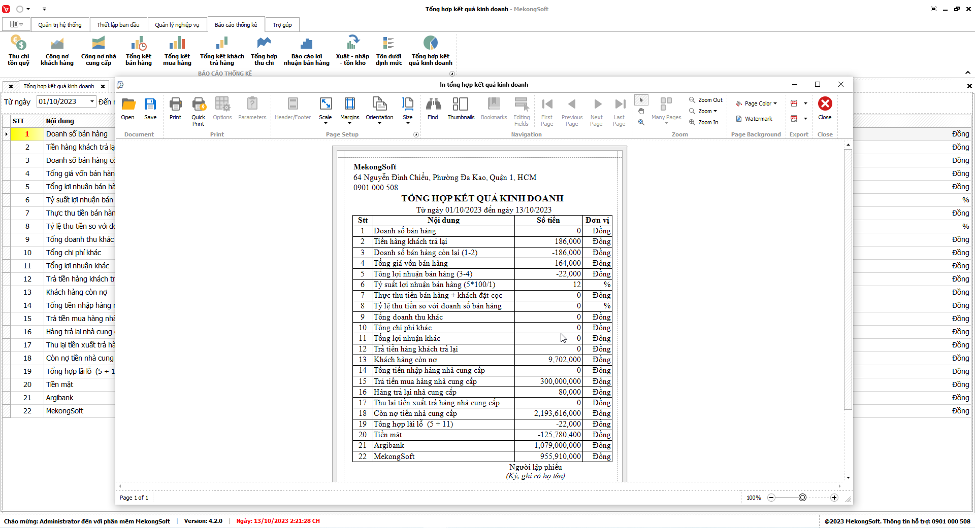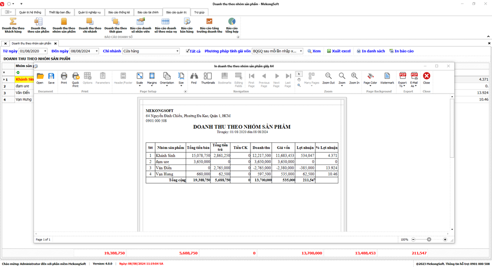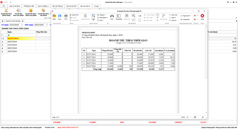2. Nhấp vào Print để in báo cáo tổng hợp kết quả kinh doanh