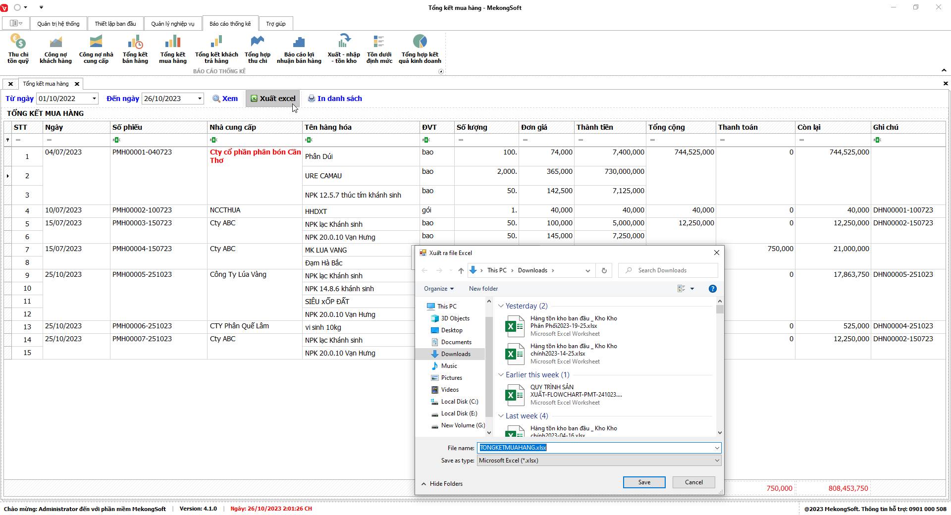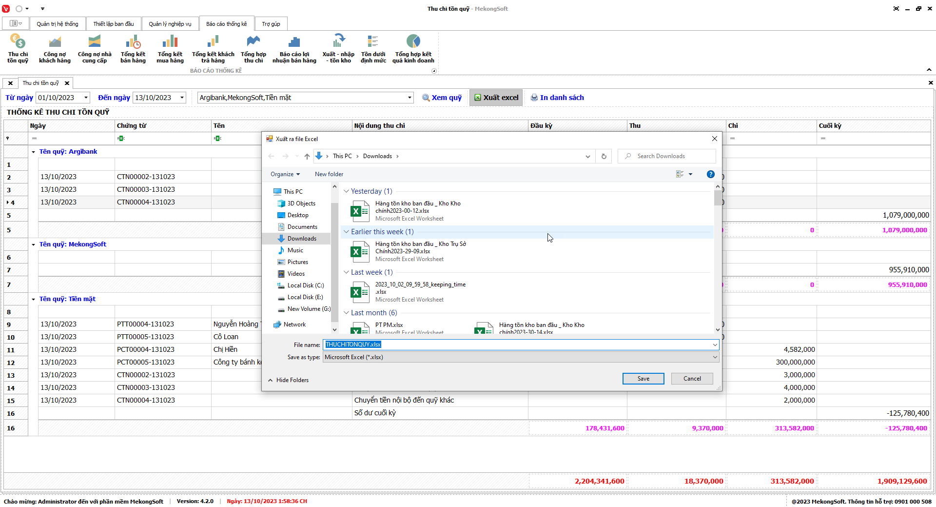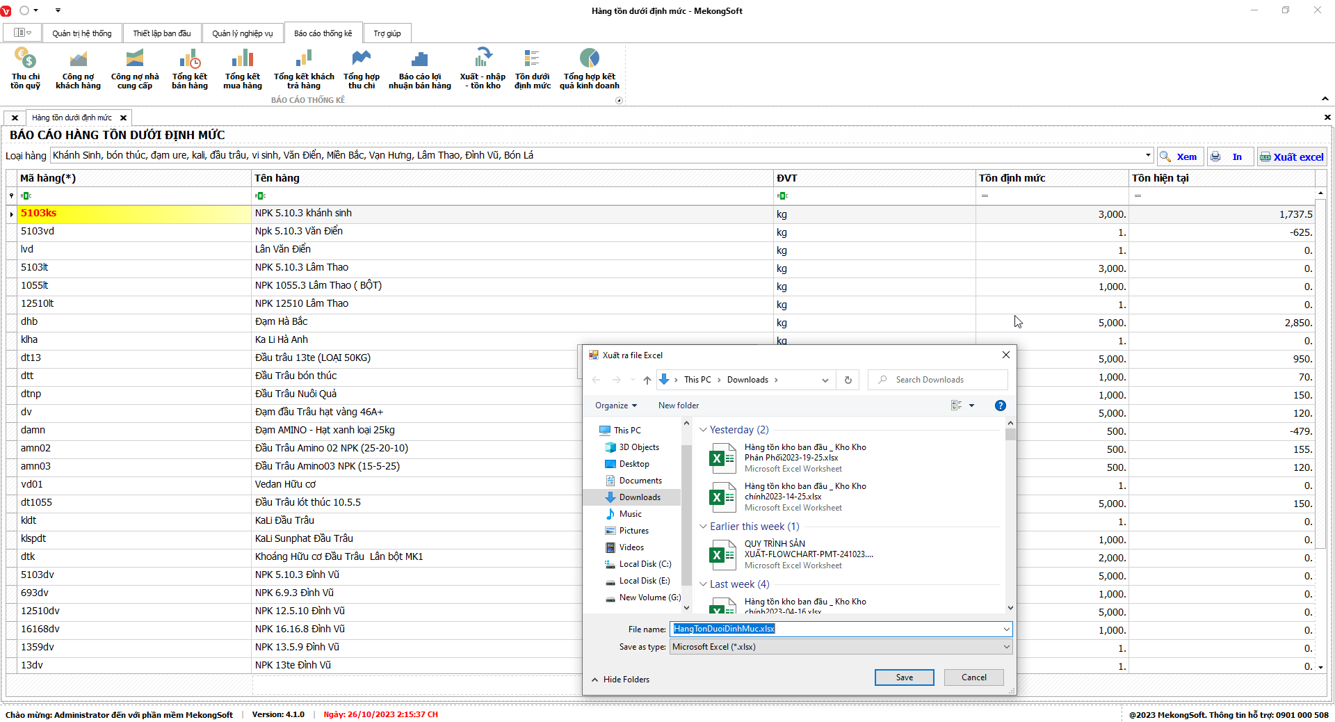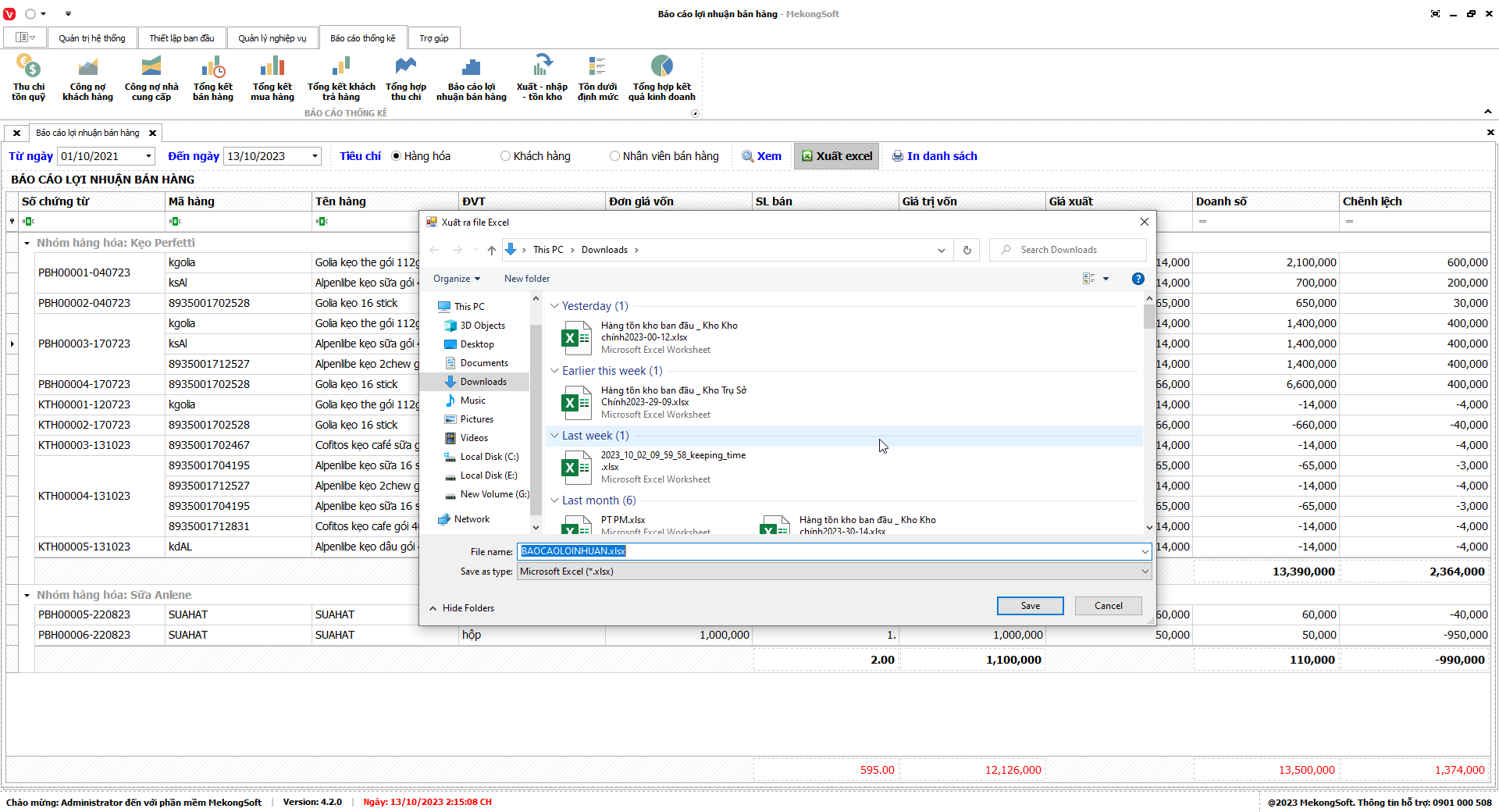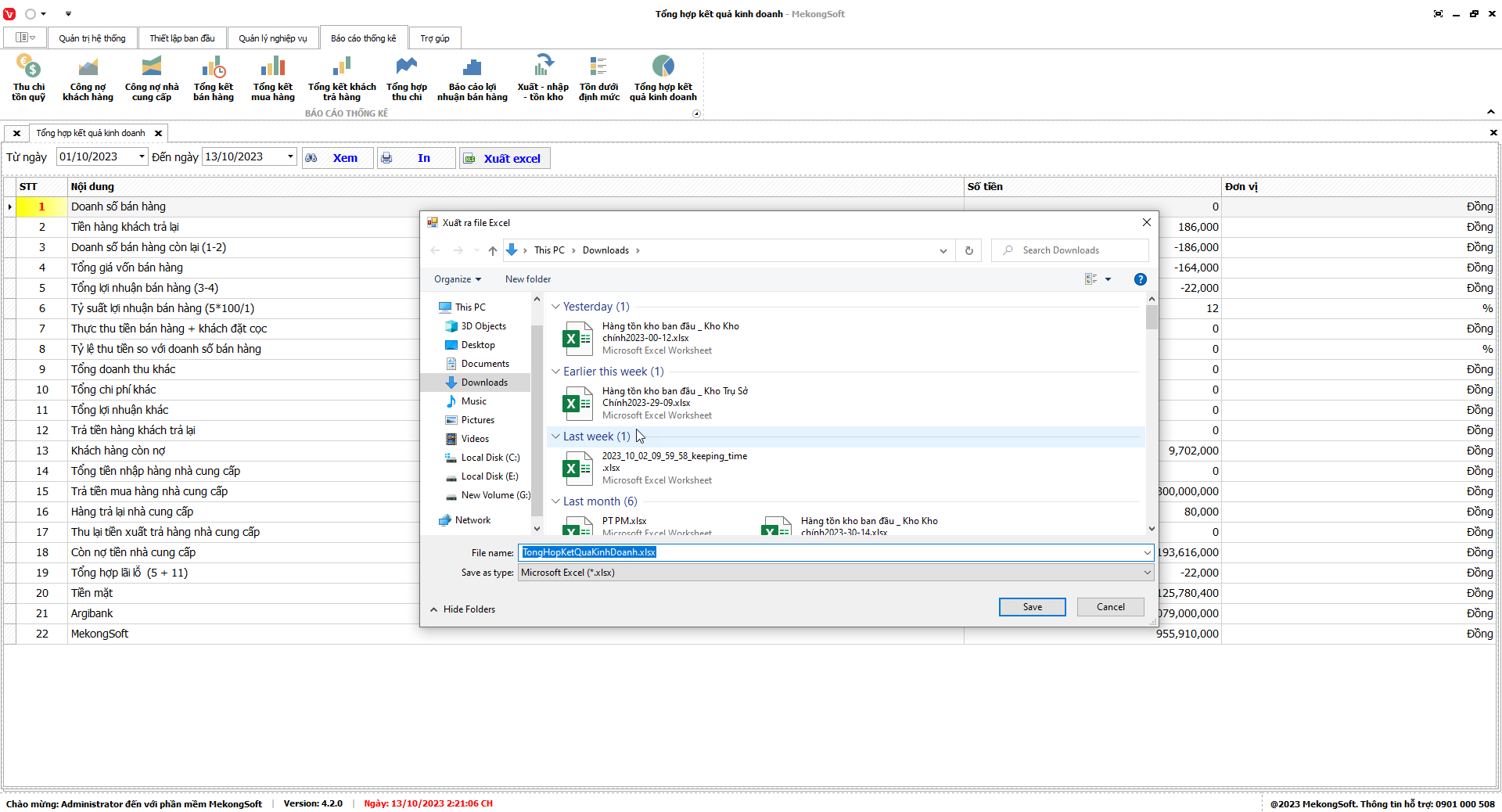 Phần mềm sẽ xuất báo cáo tổng hợp kết quả kinh doanh dưới dạng file excel.