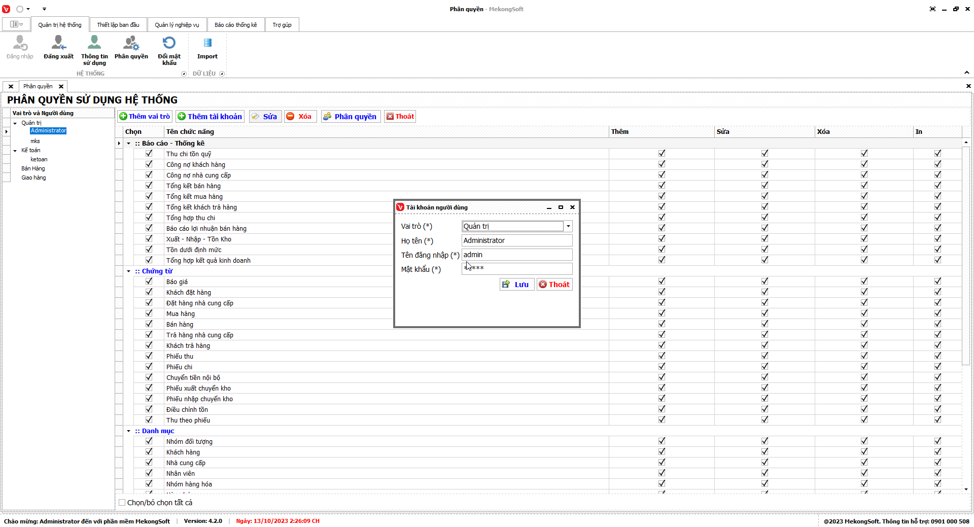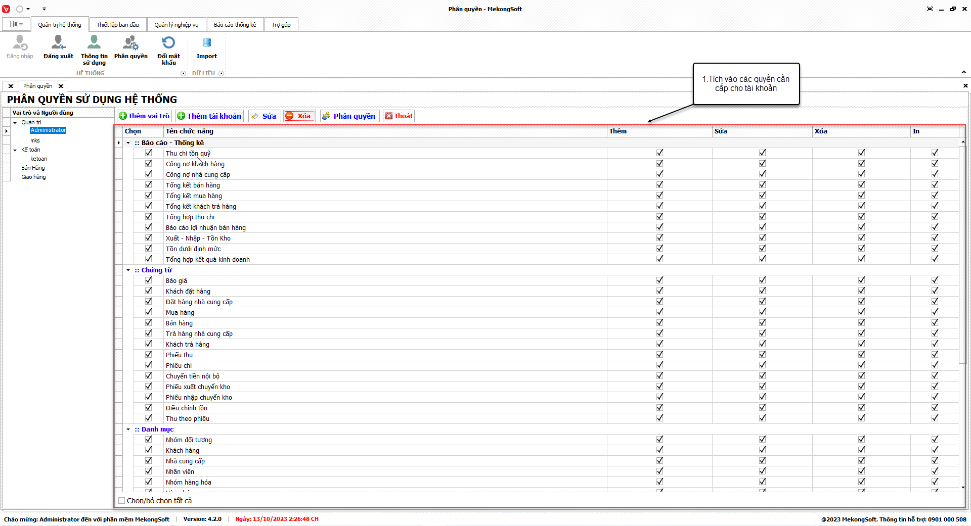 2. Tích vào các quyền cần cấp cho tài khoản gồm: quyền truy cập, thêm, sửa, xóa, in.
